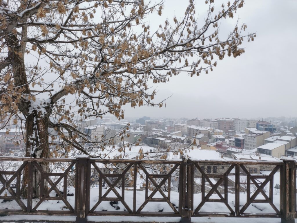 このトルコの山岳地帯の小さな街に雪がふってる。