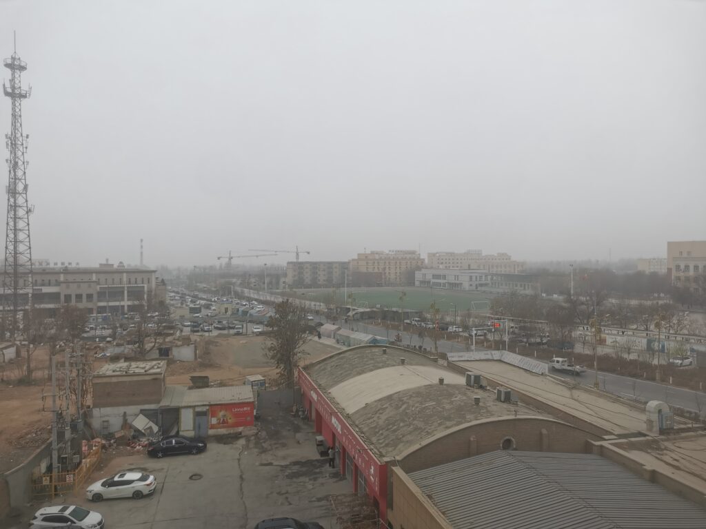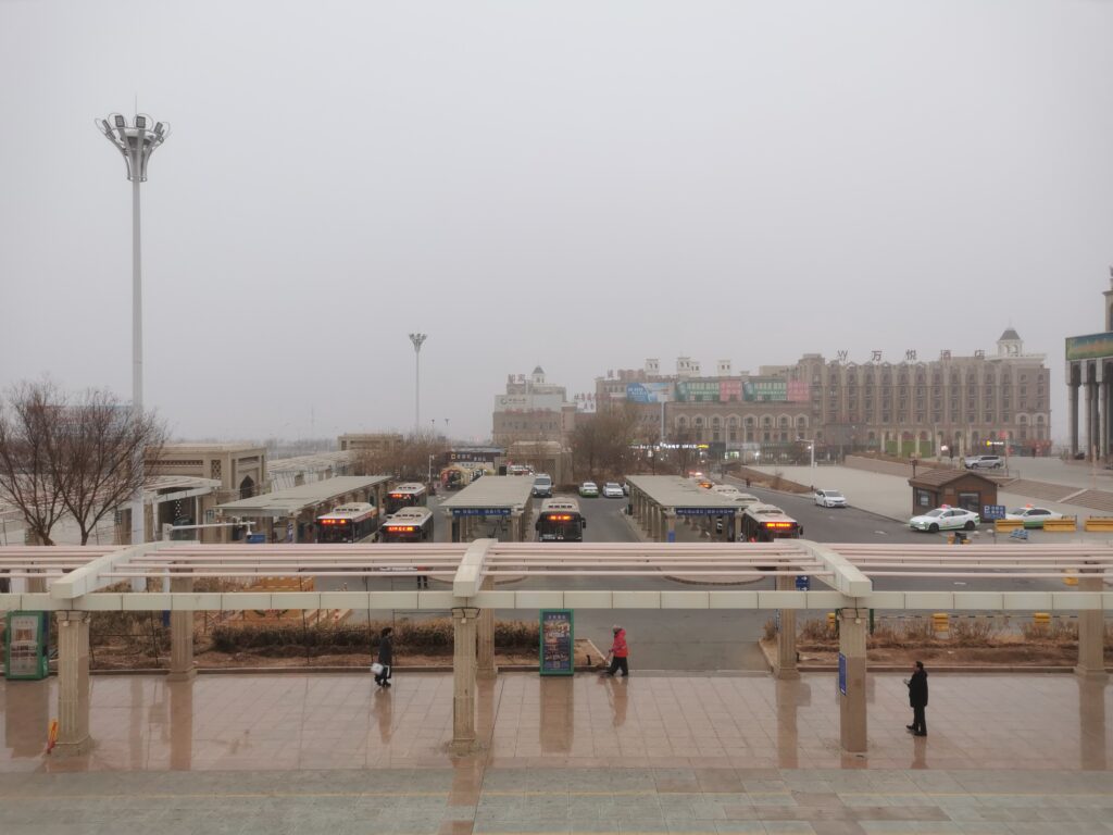 トルファンの駅前は霧が立ち込めてて身を切るような寒さ。