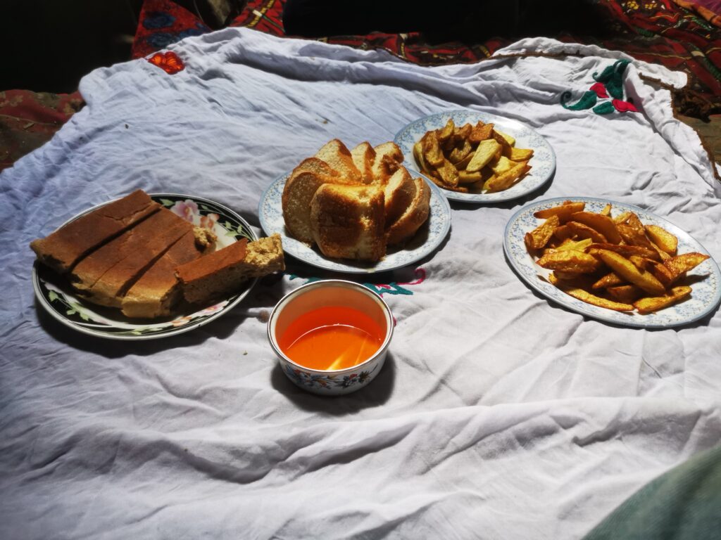 パンを食べさせてもらったんだけど、オレンジ色の液体が置いてある。
